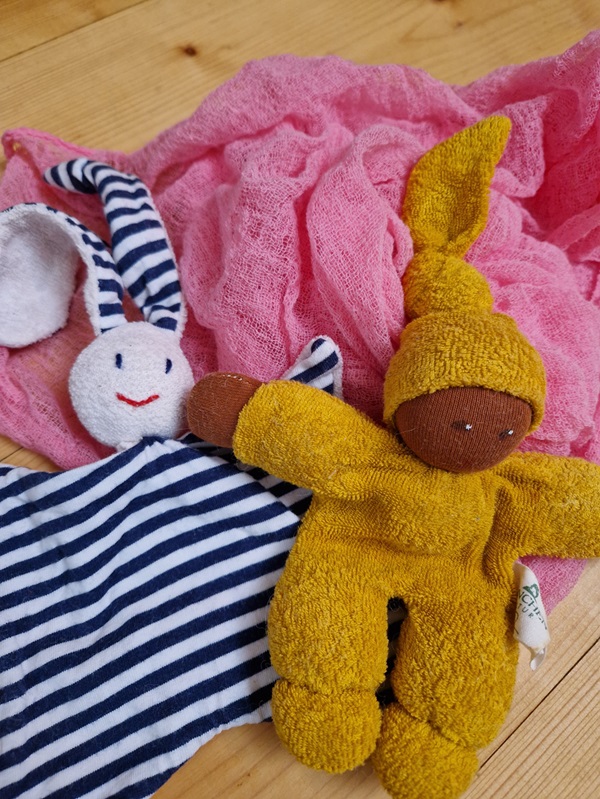 Nicht alle Gegenstände sind für diese erste Zeit geeignet. Wichtig ist, dass es sich um Dinge handelt, die sich gut ergreifen lassen wie ein Tuch, ein weiches Stoffpüppchen oder ein hübscher Greifling.