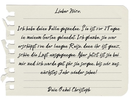 Auf das Briefpapier schreibt er seinen Namen, seinen Nachnamen und seine Adresse. Er faltet das Papier ganz klein, bindet Bellas Schnur drumherum und verknotet sie fest. Damit er eine Nachricht bekommt, wenn jemand Bella gefunden hat.