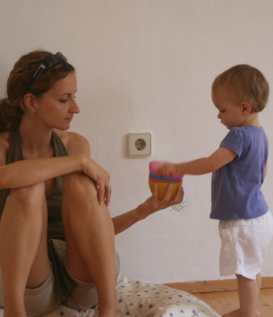 Als SpielRaum-Leiterin stelle ich eine Brücke dar zwischen der Begleitung der Eltern und der Gewöhnung daran, dass auch andere Menschen die Kinder begleiten. Ich sorge mich um die Umgebung, halte den Raum und die Zeit im Auge und begleite die Kinder bei Schwierigkeiten. So begleite ich sie zum Beispiel beim Klettern, nehme Teil an ihrem Spiel und gebe Worte für ihre Handlungen.