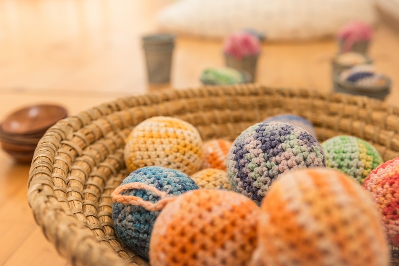 Kinder lieben große Körbe oder Behältnisse, in die sie sich reinlegen oder setzen können. Manchmal fülle ich die Kiste mit Bällen oder Schüsseln, manchmal bleibt sie auch leer. Ich achte bei den Vorbereitungen auf die Spielvorlieben der jeweiligen Kinder. Statt der Krabbelkiste stelle ich gerne auch verschieden große Körbe zur Verfügung.