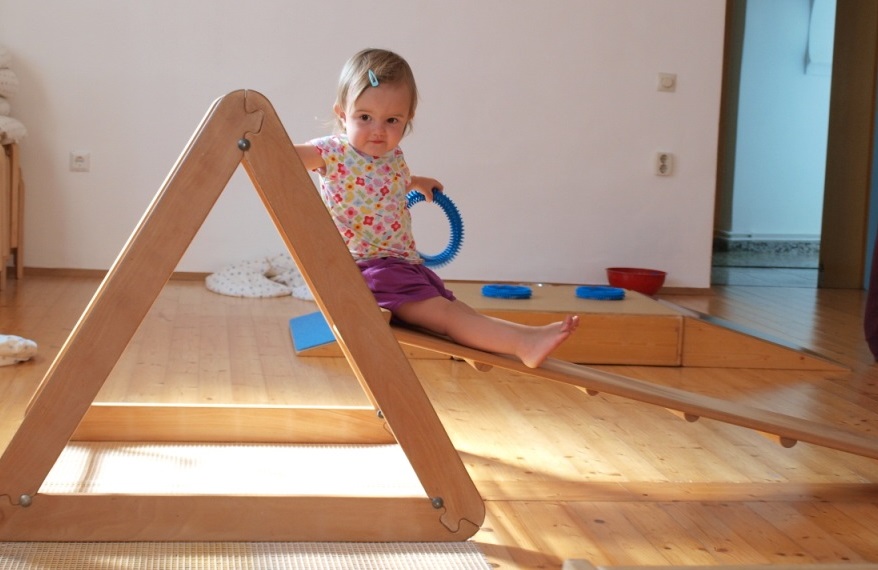 Schon sehr junge Kinder interessieren sich für Stufen und Erhöhungen. Das Podest bietet durch seine Größe genügend Möglichkeiten, sicher rauf und runter zu krabbeln. Die schrägen Ebenen werden gerne zum Rutschen verwendet. Eine freudige Herausforderung ist die Schräge für das Kind, das erst Gehen gelernt hat. Ältere Kinder beobachte ich dabei, wie sie das Stufensteigen ohne Anhalten auf dem Podest üben.