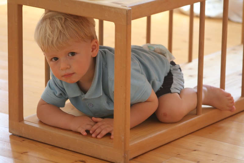 Der Holztunnel lädt zum Durchkrabbeln und zum Draufklettern ein. Durch die Gitterstäbe ist er auch innen hell und die Kinder können jederzeit Blickkontakt zu den Erwachsenen “draußen” aufnehmen. Kinder, die gerade lernen, sich hoch zu ziehen, benutzen die Gitterstäbe, um sich daran fest zu halten. Zusätzlich zum Piklertunnel verwende ich die beiden würfeligen Anbauteile gerne alleinstehend, weil in meinem SpielRaum für das ganze Labyrinth zu wenig Platz ist.