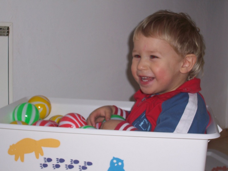 Kinder lieben große Körbe oder Behältnisse, in die sie sich reinlegen oder setzen können. Manchmal fülle ich die Kiste mit Bällen oder Schüsseln, manchmal bleibt sie auch leer. Ich achte bei den Vorbereitungen auf die Spielvorlieben der jeweiligen Kinder. Statt der Krabbelkiste stelle ich gerne auch verschieden große Körbe zur Verfügung.